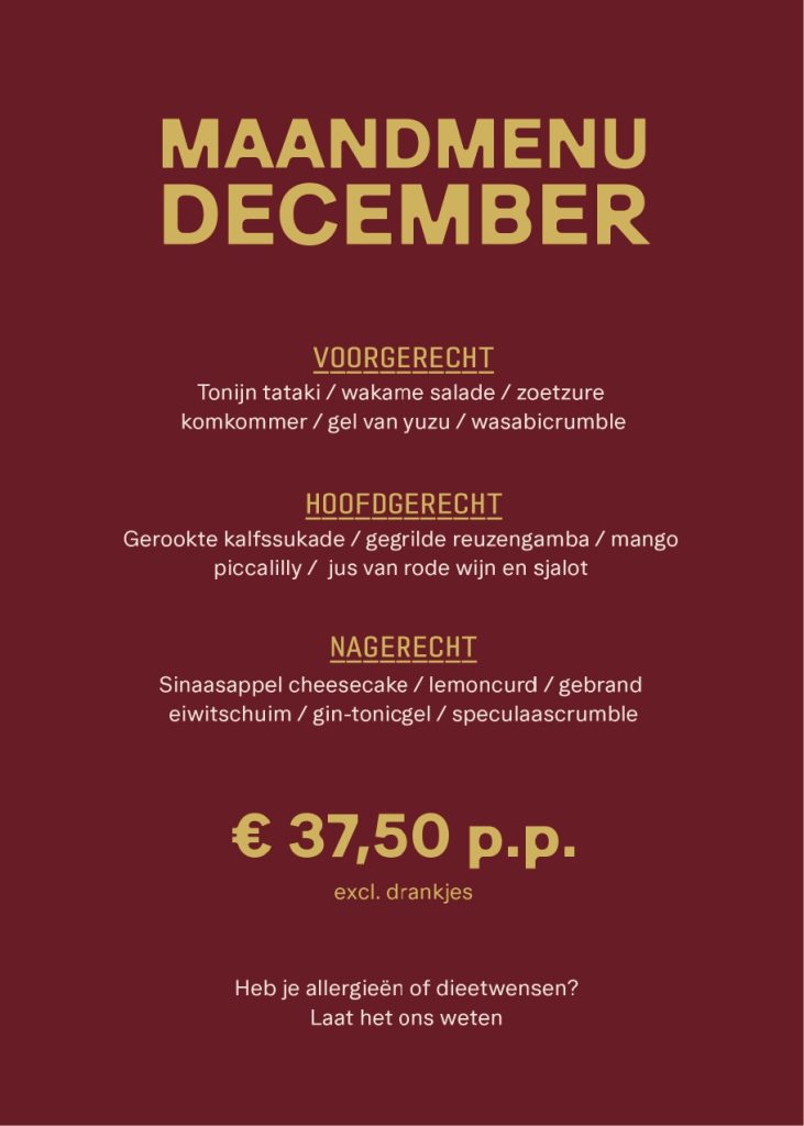 Tot en met 24 december 2025 kunt u bij ons genieten van het speciale December Maandmenu. Het December maandmenu is naast onze reguliere menukaart.
